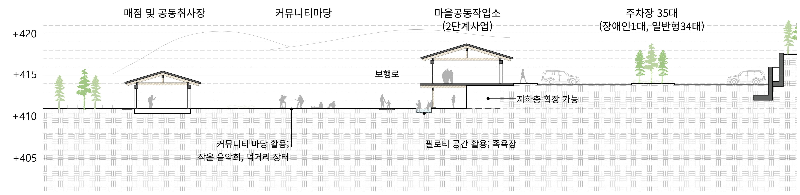 긴 대상지 중앙, 경작과 건축으로 종횡의 지형선이 꼬이는 곳에 수평적이고 얇은 건축으로 지형을 정리하였다. 주출입구에 들어서면 커뮤니티 존을 중심으로 나뉜 오토캠핑 영역과 일반캠핑 영역을 볼 수 있다. 중앙의 마당은 행사, 작업, 판매장 등 다양한 행위가 가능한 유연한 장소이다. 마을 공동 작업장을 거점으로 선형으로 구성되어 있는 삼각동 마을의 중심공간이 되었으면 한다.