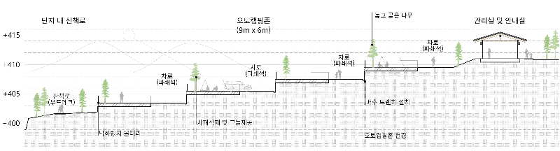일반형 캠핑장은 도로에서 계곡으로 이어지는 경사지와 평지가 교차하는 땅에 배치한다. 보행로보다 높은 데크를 형성해 시각적 차이를 두고 높은 레벨에서 잔디와 계곡 너머 숲을 조망할 수 있도록 하였다. 계곡 방향 보행로 아래는 수변형 캠핑존을, 낮은 둔덕에는 잔디형 캠핑존을 배치해 독립적인 영역을 확보했다.