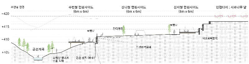 오토캠핑장은 사과 과수원이 있던 완만한 경사 부지에 배치했다. 본 대지는 남쪽 방향과 서쪽으로 장엄한 원경을 가진 개활지이다. 기존 경사를 활용해 차량 경사로를 배치하고 경사 앞뒤로 차로를 두어 텐트 간섭을 최소화하였다.